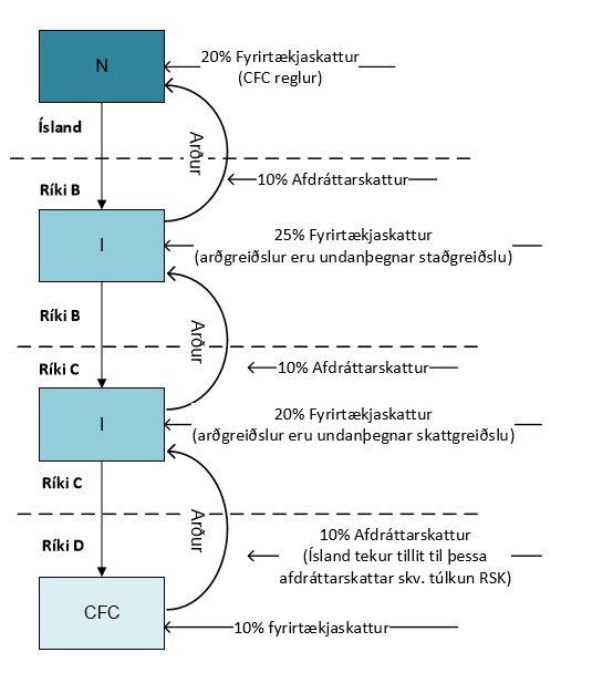 Í dæminu er gengið út frá því að íslenska félagið N eigi dótturfélag í ríkinu B sem svo á dótturfélag í ríkinu C sem síðan á félag í ríkinu D. Félagið í ríkinu D telst vera CFC-félag skv. íslensku reglunum. Þess ber að geta að ríkið B telur að félagið í ríki D sé CFC-félag og beitir sínum CFC-reglum. Arðgreiðslur fara fram frá einu félagi til annars. Það er D greiðir arð til C, C greiðir svo arð áfram til B sem síðan greiðir arð til N. Mismunandi heimildir eru til afdráttarskattlagningar af arðgreiðslum í ríkjunum: